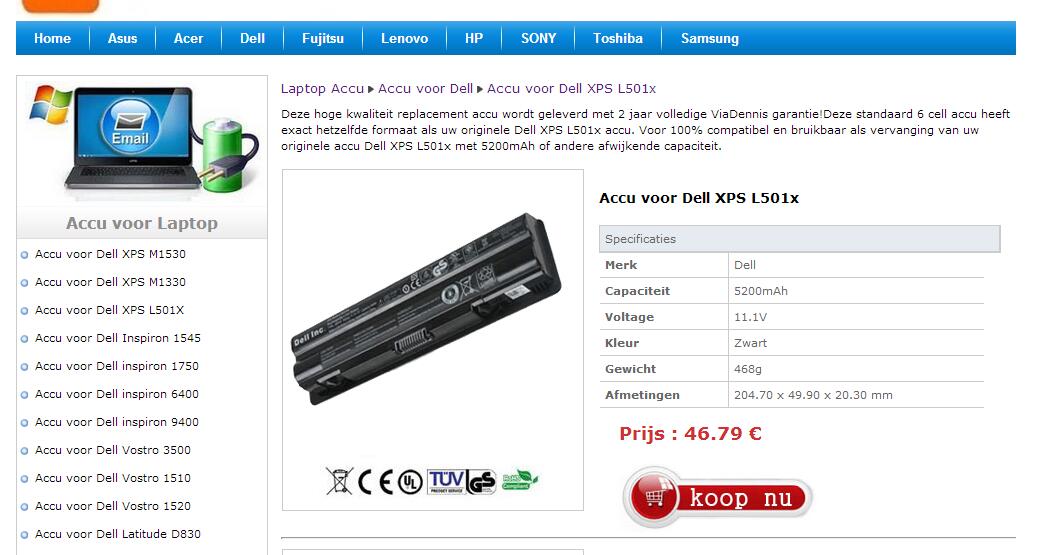 http://www.koopaccu.com/dell-xps-l501x.html Deze hoge kwaliteit replacement accu wordt geleverd met 2 jaar volledige ViaDennis garantie!Deze standaard 6 cell accu heeft exact hetzelfde formaat als uw originele Dell XPS L501x accu. Voor 100% compatibel en bruikbaar als vervanging van uw originele accu Dell XPS L501x met 5200mAh of andere afwijkende capaciteit.